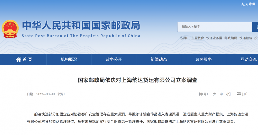 公告显示,韵达快递部分加盟企业对协议客户安全管理存在重大漏洞,导致涉诈骗宣传品进入寄递渠道,造成受害人重大财产损失。上海韵达货运有限公司对其加盟商管理缺位,负有未按规定实行安全保障统一管理责任,国家邮政局依法对上海韵达货运有限公司进行立案调查。