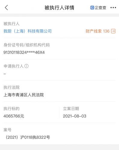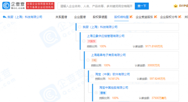 我厨(上海)科技有限公司被上海市青浦区人民法院列为被执行人,企查查信息显示,该公司由淘宝关联公司上海云象供应链管理有限公司全资控股。