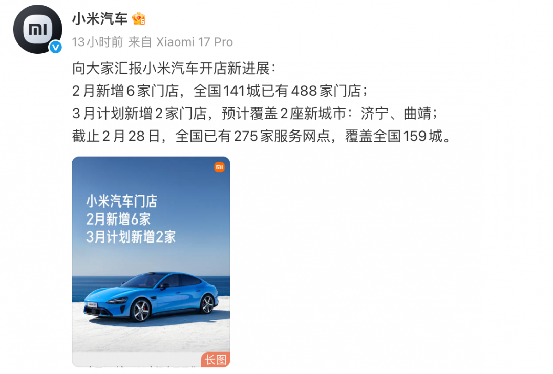 此外,小米汽车还公布了小米汽车开店新进展: