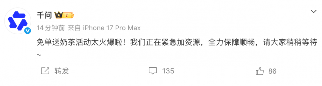 对此,千问官微发文回应称,“免单送奶茶活动太火爆啦!我们正在紧急加资源,全力保障顺畅,请大家稍稍等待。”