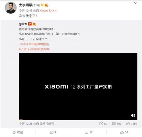 真首发!雷军预热小米12:第一时间把最新最酷的科技带给用户快讯