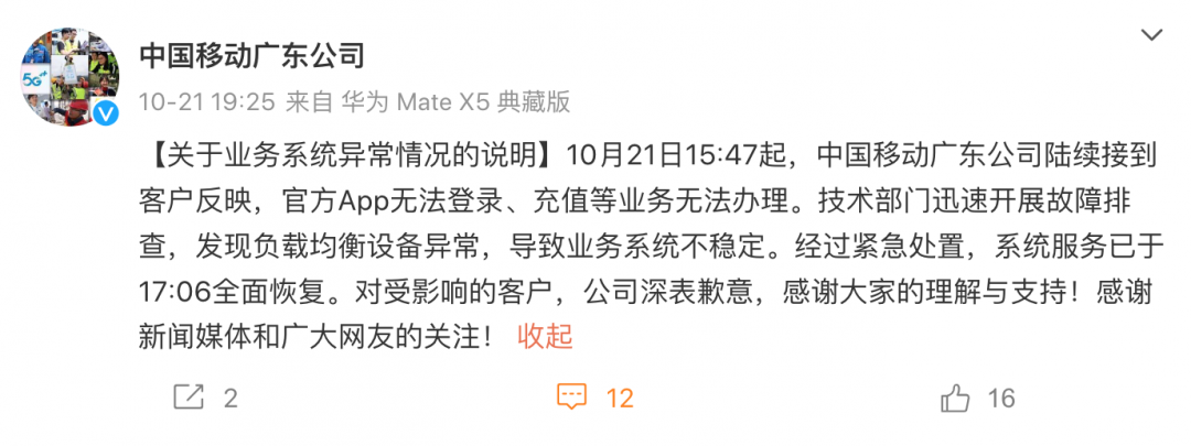 当晚,中国移动广东公司官微发文回应称,10月21日15:47起,中国移动广东公司陆续接到客户反映,官方App无法登录、充值等业务无法办理。技术部门迅速开展故障排查,发现负载均衡设备异常,导致业务系统不稳定。经过紧急处置,系统服务已于17:06全面恢复。