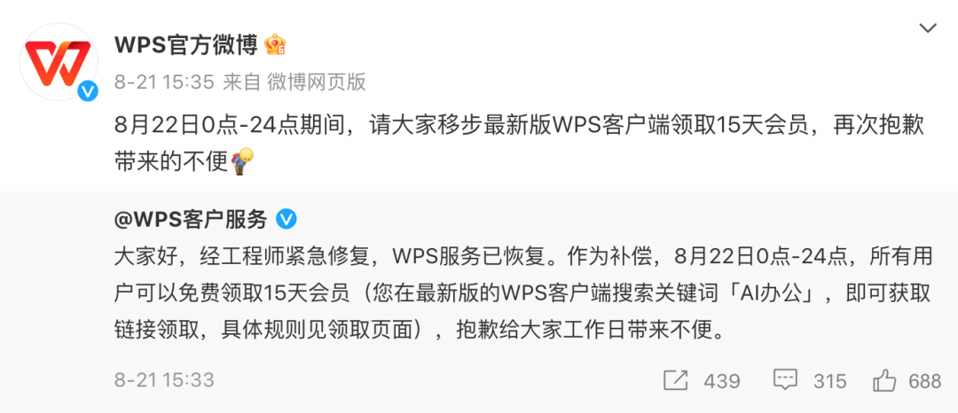 8月21日WPS就因发生服务异常而引发热议。当天下午,WPS客户服务官微回应:经紧急修复,WPS服务已恢复。作为补偿,8月22日0点-24点,所有用户可以免费领取15天会员。