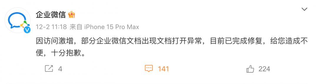 随后,企业微信文档官微发文称,“因访问激增,部分企业微信文档出现文档打开异常,目前已完成修复。”