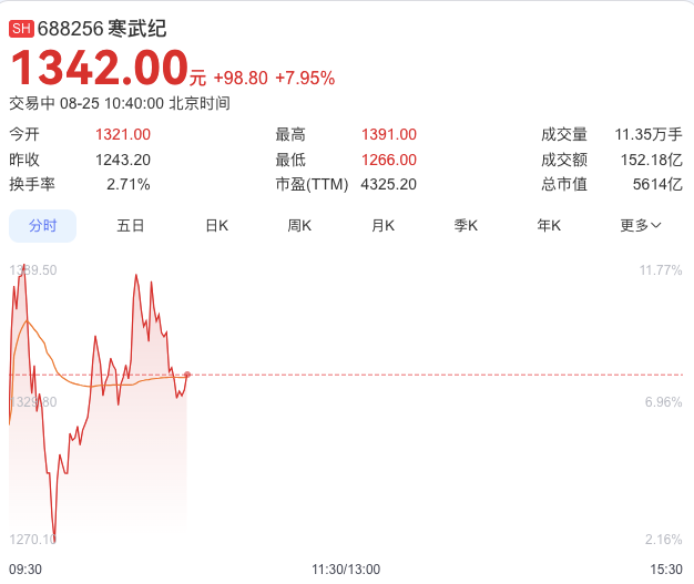 【TechWeb】8月25日消息,AI硬件股再度大涨,寒武纪股价再次达到新高,高开超6%股价突破1300元,截至发稿涨7.95%,报1342元。