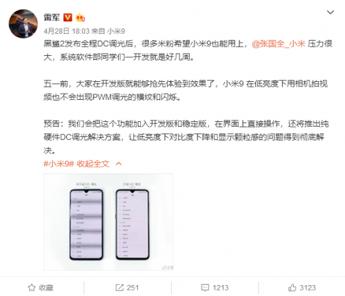 雷军还表示,小米9会把这个功能加入开发版和稳定版,在界面上直接操作,还将推出纯硬件DC调光解决方案,让低亮度下对比度下降和显示颗粒感的问题得到彻底解决。
