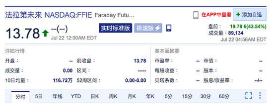 7月22日下午消息,法拉第未来美股盘前涨超40%,报19.78美元每股。该公司今日将登陆纳斯达克,股票代码为“FFIE”。