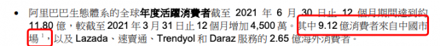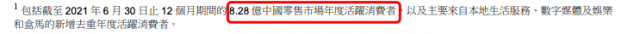 值得注意的是,阿里此次在用户数上并没有像以往那么公开,更多的是强调全球市场以及所有业务线。在财报中,阿里表示,截至2021年6月30日季度,阿里巴巴生态体系全球年度活跃消费者达到了11.8亿,较上一季度增加4500万,其中有9.12亿消费者来自中国市场。在这之中,中国零售市场年度活跃消费者达到8.28亿。但是,这一数字则被“隐藏”在了注释中。