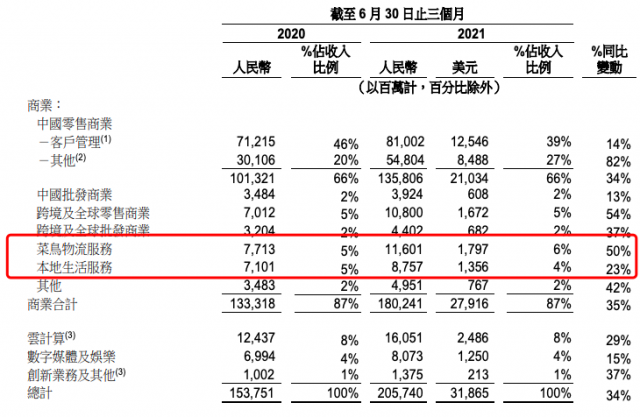 而从财报中公开的数据还能够看出,相对比较本地生活业务,菜鸟的表现更为突出,营收占比分别为4%和6%。对比之下,去年两者的收入占比还处于持平的状态。