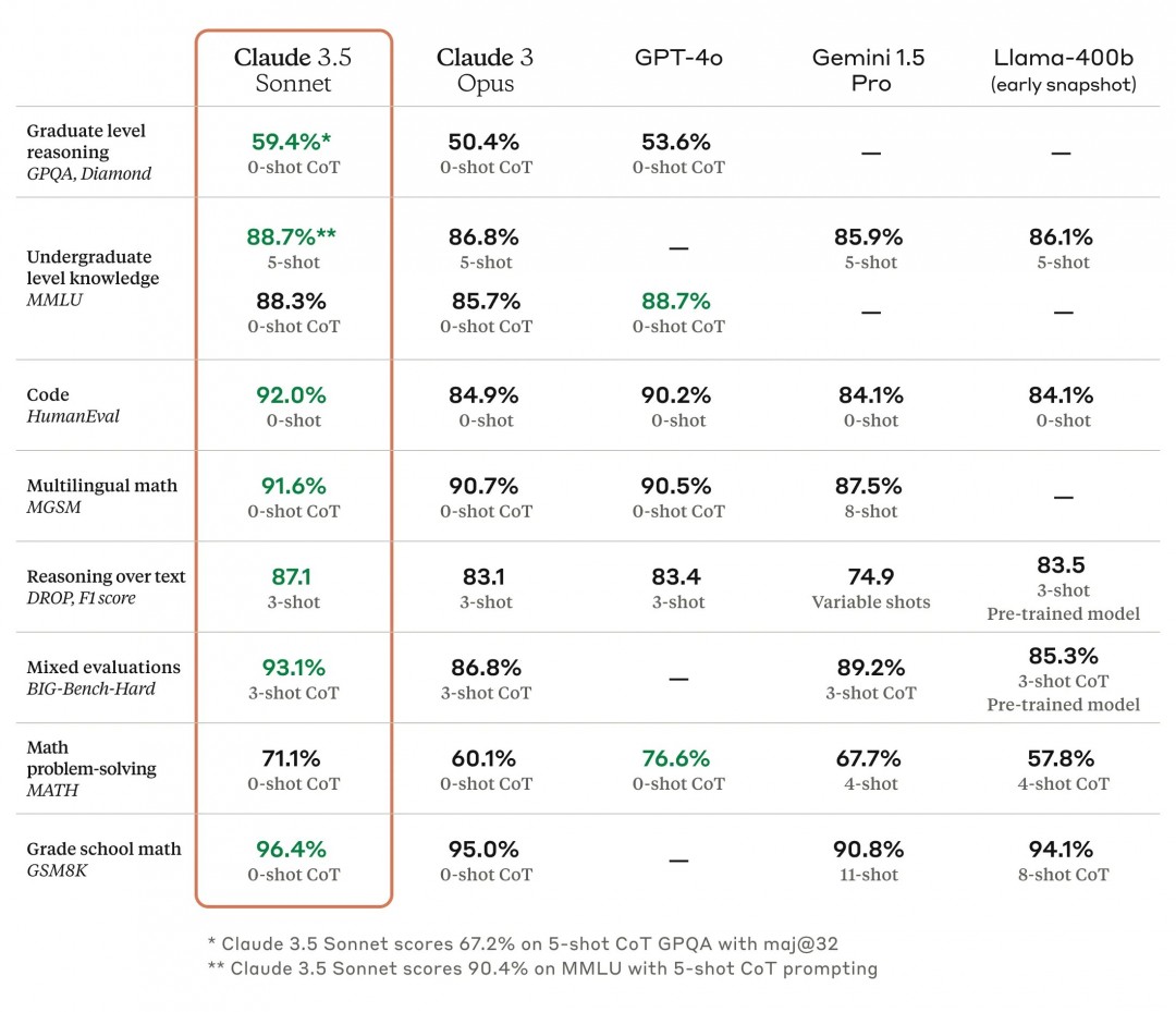 Claude 3.5 Sonnet虽然在零样本MATH和MMLU评测中小幅落后GPT-4o,但在研究生级推理(GPQA)、本科级知识(MMLU)和编码能力(HumanEval)上设立了新的行业基准。