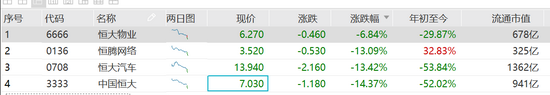 7月20日消息,昨日恒大系集体重挫,昨日收盘,恒大汽车跌19.10%,中国恒大跌超16%,恒大物业跌超13%,恒腾网络跌11.76%。今日开盘,恒大系涨跌不一,盘初跌幅扩大。截至发稿,中国恒大跌14%,跌破千亿市值,恒大汽车跌13%,恒大物业跌7%,恒腾网络跌13%。