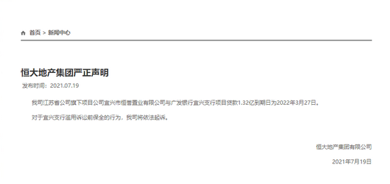 昨日,恒大集团在官网发布声明:我司江苏省公司旗下项目公司宜兴市恒誉置业有限公司与广发银行宜兴支行项目贷款1.32亿到期日为2022年3月27日。对于宜兴支行滥用诉讼前保全的行为,我司将依法起诉。