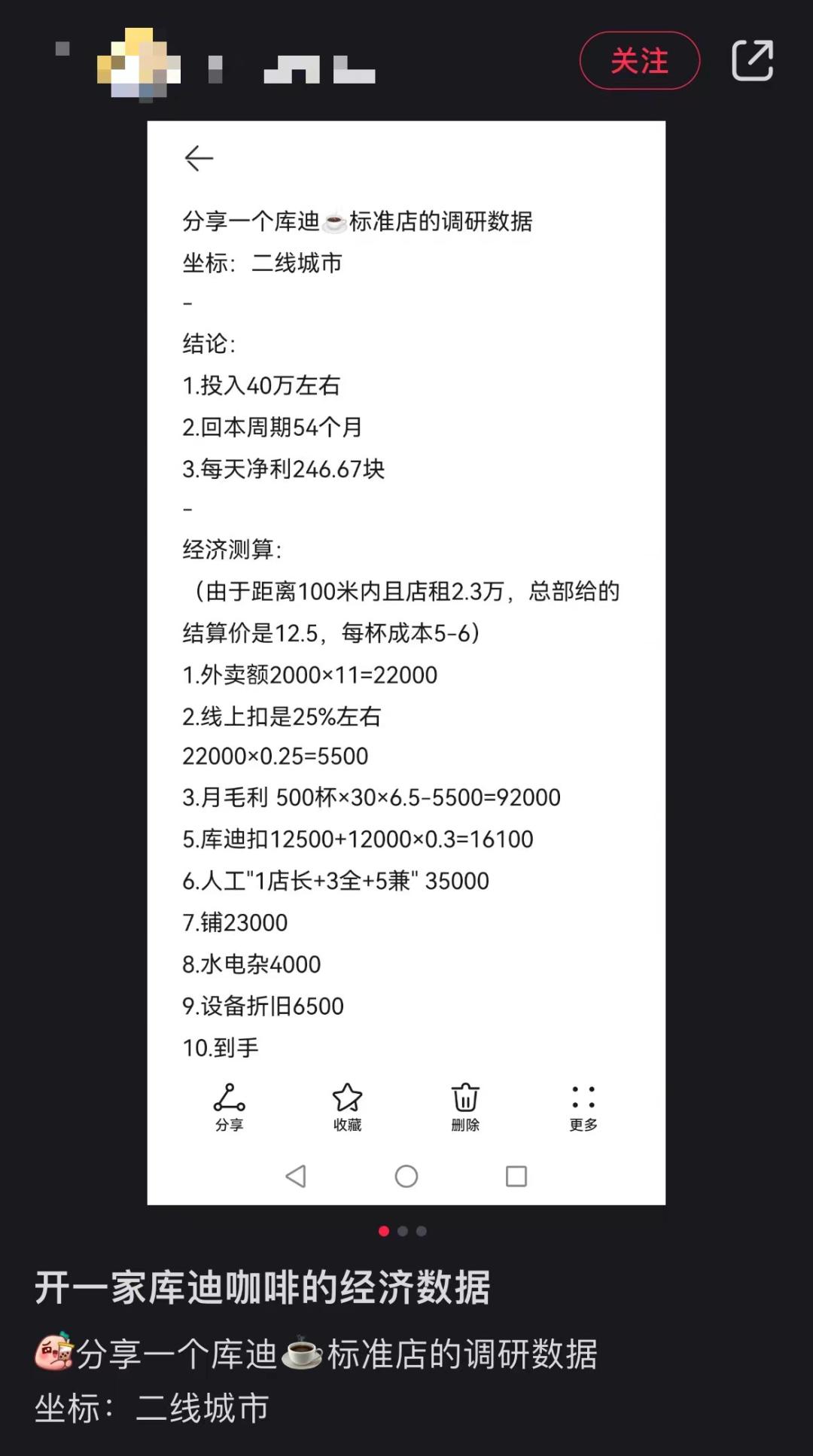 有一位库迪的联营商在小红书上算了一笔账,一家二线城市的标准店,投入总共在40万左右,每天的杯量能有500杯,这在行业内已经算是一个不错的数据了,然而他每天的净利却只有246.67元。