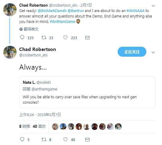 在推特AMA活动中,一位ID为Nate L.的网友提问说:在升级到下一世代主机时,(《圣歌》的)存档文件能否继承?对此Chad Robertson表示,这肯定是可以的(Always)。