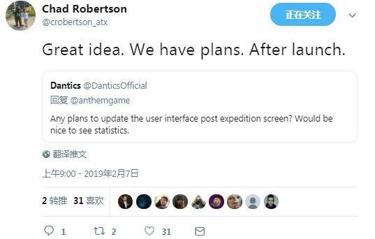 另外也有网友询问开发者有没有计划改进一下远征归来的界面UI,他希望能看到玩家们各自的数据。Robertson表示,这是个很好的想法,官方团队也有相关的计划了,不过得等到发售之后了。