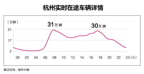 数据显示,杭州主城区第一个通行峰值出现在上午8点左右,共计 31万辆;晚高峰在18点左右到来,共计30.1万辆;而平峰时段,车辆数在20万-25万间呈现波段浮动。