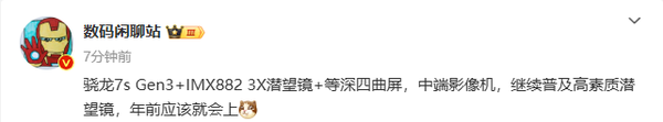 据知名数码博主@数码闲聊站 最新发布的信息显示,有一款中端影像机型,主打继续普及高素质潜望镜,将搭载骁龙7s Gen 3移动平台,配备索尼IMX882 3X潜望式长焦镜头,采用等深四曲屏,有望在年前亮相。结合此前相关爆料,该机很可能就是realme真我旗下的最新数字系列超大杯机型——真我14 Pro+,与前代机型真我13 Pro+的配置风格相近,尤其在长焦拍摄方面提供了超越同级产品的硬件。