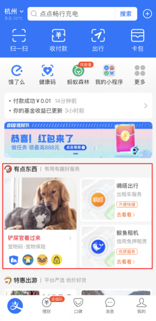这是支付宝在首页新增的又一小程序入口,支付宝首页新增一个名为「有点东西」的服务频道,过去半年支付宝为第三方小程序上线或内测了多个首页曝光位。