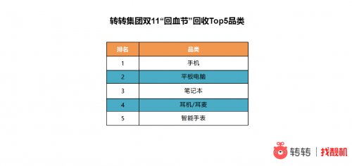 就像上文中那位闲鱼小达人说的那样,在二手平台上,数码3C以及美妆产品往往比较紧俏。根据转转公布的数据显示,集团旗下转转和找靓机两大平台11月12日至11月21日通过“回血节”活动专区回收的手机3C品类top5为手机、平板电脑、笔记本、耳机/耳麦和智能手表。