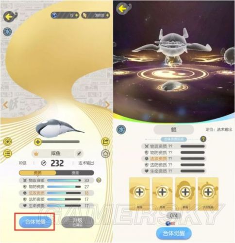 4、御灵师集齐四种鱼并全部升到10级,即可点击【合体觉醒】按钮进入界面进行觉醒,合体觉醒界面中有合体觉醒所需妖灵和觉醒后目标妖灵。