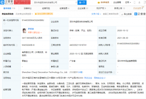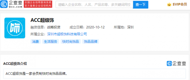 企查查信息显示,ACC超级饰是一家会员制快时尚饰品品牌,其公司成立于2020年,法定代表人为罗辉德,注册资本3417.97万元人民币,经营范围包含:供应链管理;包装服务,货物或技术进出口;第三类医疗器械经营等。