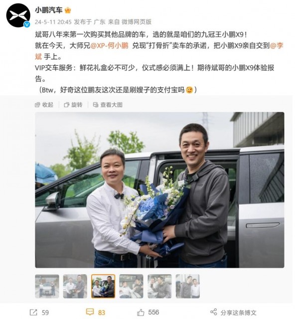 IT之家 5 月 12 日消息,综合小鹏汽车官微、小鹏创始人何小鹏及蔚来创始人李斌个人微博,何小鹏已经于 11 日兑现此前“打骨折”卖车的承诺,将一辆小鹏 X9 亲自交到李斌手上。