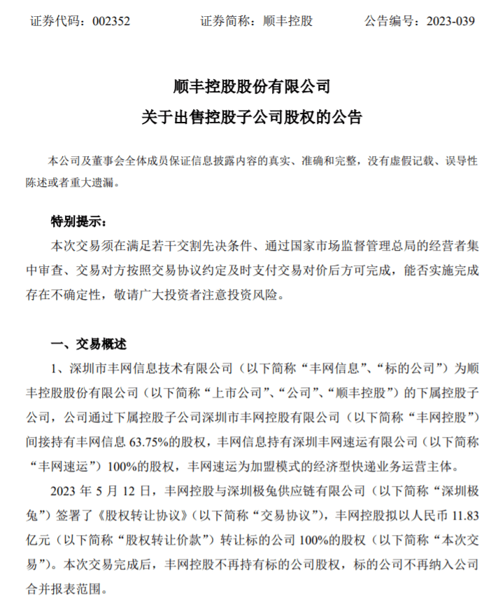 5月12日晚间,顺丰控股(002352.SZ)发布公告称,下属控股子公司深圳市丰网控股有限公司(简称“丰网控股”),与极兔速递下属子公司深圳极兔供应链有限公司签署了《股权转让协议》,丰网控股拟以人民币11.83亿元转让全资子公司深圳市丰网信息技术有限公司(简称“丰网信息”)100%股权。