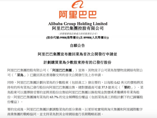 阿里撤回菜鸟上市申请 拟37.5亿美元收购菜鸟少数股东股权快讯