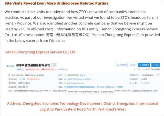 灰熊在报告中还提到,中通快递通过利用未披露的关联方,将运营费用转移到了表外。若干中通快递交易对手由中通快递的员工或其管理团队的家人和朋友拥有和控制。“我们的现场访问发现了更多潜在的未披露关联方,一些独立的实体在彼此紧邻的地方运营,共享logo。”