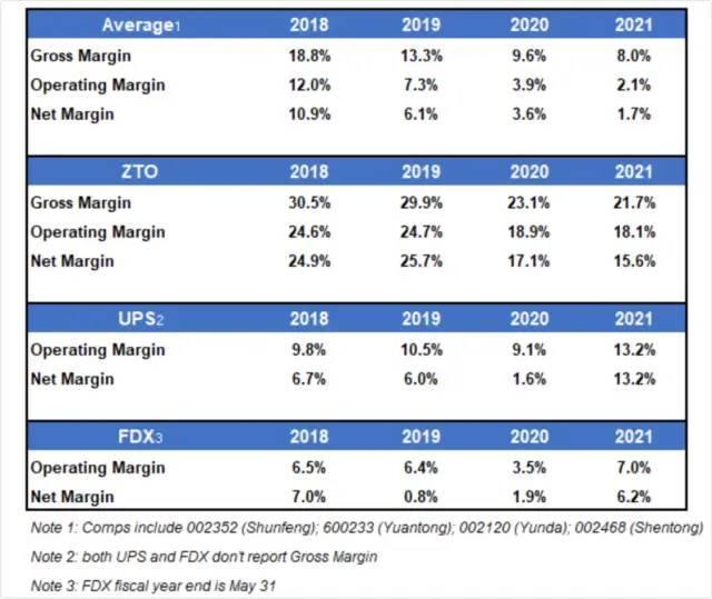 例如在2021年,包含顺丰、圆通、韵达、申通在内的中国快递业平均毛利率为8.0%,运营利润率为2.1%,净利润率为1.7%,而相应的中通快递的这三项指标分别高达21.7%,18.1%和15.6%。