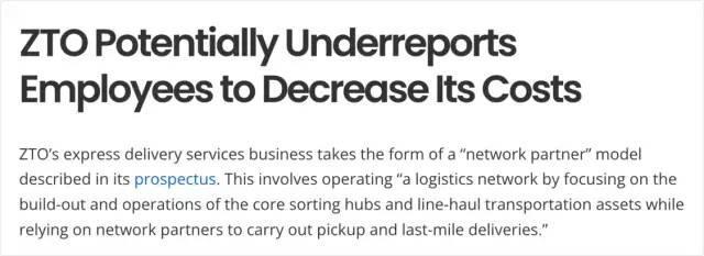 因此灰熊认为,中通未能将这部分员工的成本纳入进来,导致利润虚高。做空报告中指出,因为中通故意报低员工人数,就可以支持其报告的劳动力成本数据,证明超高的利润率合理。以保守的薪资估计,中通的真实员工人数和相关人工费用可能比该司向SEC报告的数字高出一倍以上。