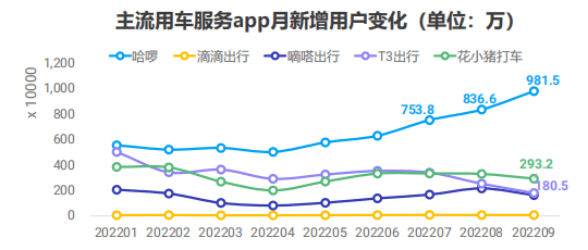 哈啰向本地生活服务商的转型,取得了一定收获。根据极光大数据统计,对比各家平台今年以来的月新增用户数据,哈啰一直保持行业领先位置,并在今年第三季度加大力度实现用户增长,月新增用户数不断攀升,9月新增用户数更逼近千万,达981.5万,与其他平台差距逐渐拉开。