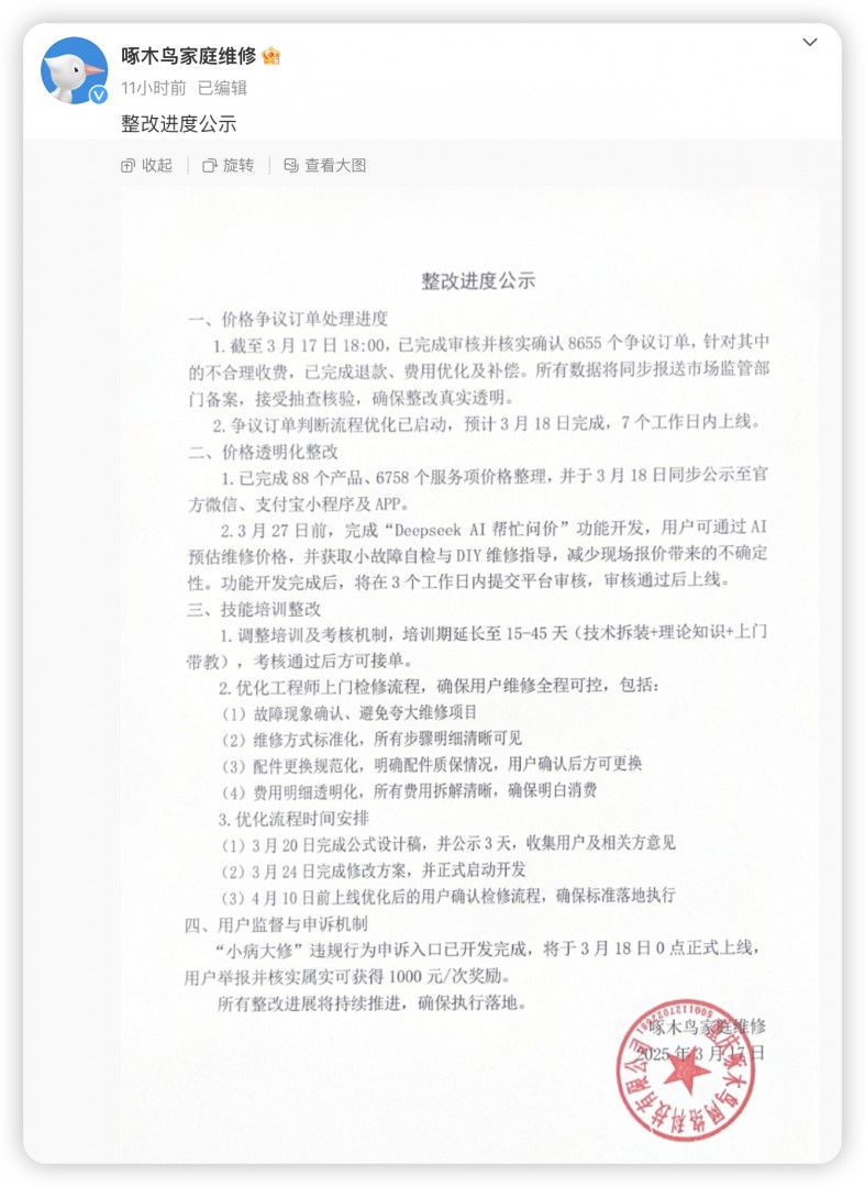 【TechWeb】3月18日消息,昨日晚间,啄木鸟家庭维修公布了最新整改进度。
