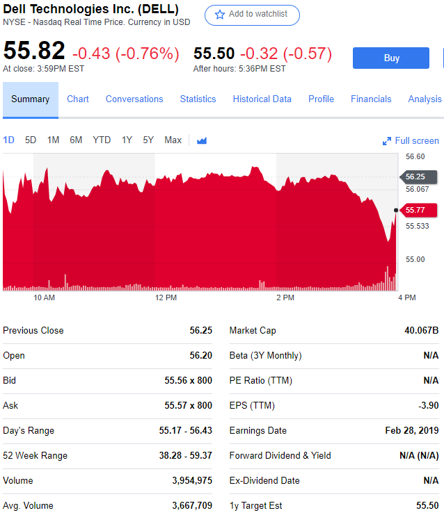 戴尔星期四在纳斯达克交易所的开盘价为56.2美元。截至收盘,戴尔股价下跌0.43美元,报收于55.82美元,跌幅为0.76%。过去52周,戴尔股价最高为59.37美元,最低为38.28美元。