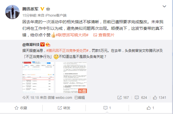 3月20日晚间消息,腾讯回应因不正当竞争受行政处罚:活动中描述不够清晰,已完成整改。