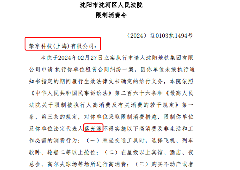 除此之外,8月20日,沈阳市沈河区人民法院还曾对怪兽充电创始人蔡光渊及附属公司挚享科技发布一则限制消费令。
