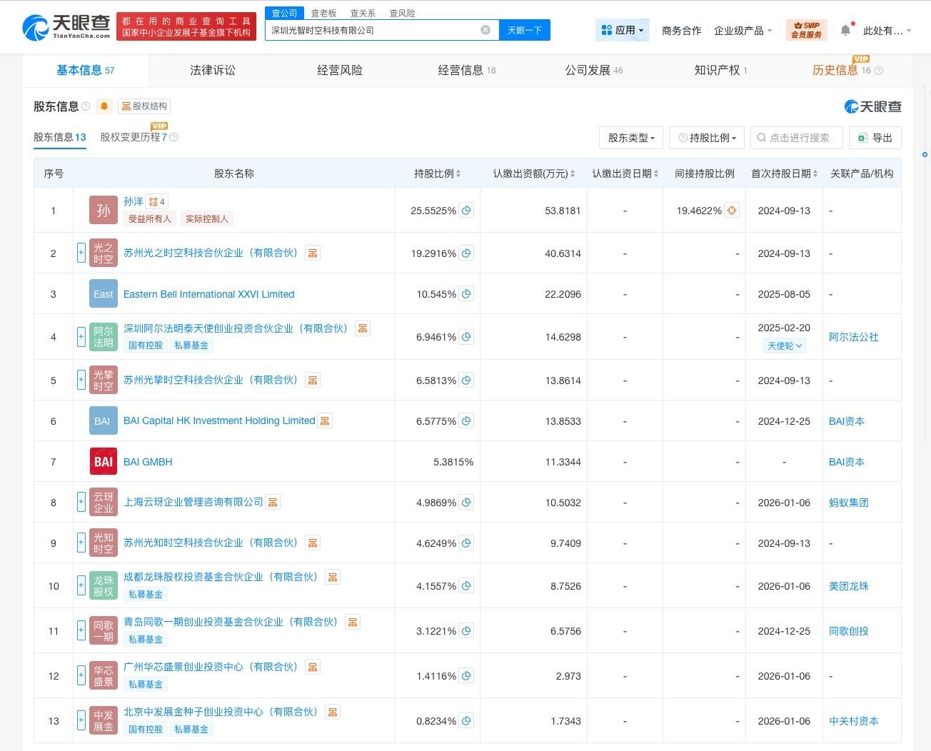 深圳光智时空科技有限公司成立于2024年9月,法定代表人为孙洋,经营范围含计算机软硬件及辅助设备零售、计算机软硬件及辅助设备批发、通讯设备销售、电子产品销售、通讯设备修理、移动终端设备制造、可穿戴智能设备制造等。股东信息显示,该公司现由孙洋、苏州光之时空科技合伙企业(有限合伙)、Eastern Bell International XXVI Limited及上述新增股东等共同持股。