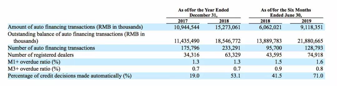 截至2019年6月末,美利车金融的汽车融资交易余额为219亿元人民币,公司M3+逾期率为0.8%。