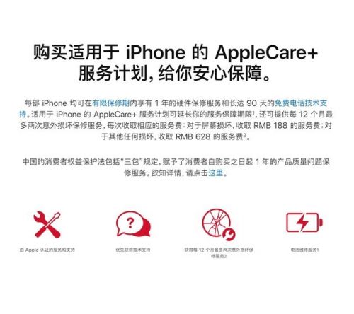 用户购买AppleCare +服务计划以后可以获得长达两年的额外硬件保修和软件支持服务,并且每12个月内最多可以进行两次意外损坏保修服务,可以以较为低廉的价格对意外损坏的iPhone进行维修。简单来讲,AppleCare +就是苹果所推出的官方意外损坏保修服务。当用户购买苹果设备以后,可以选择在购买设备时一并购买这项服务计划,或者在设备购买之日起60天之内在线购买或去Apple Store零售店进行购买。