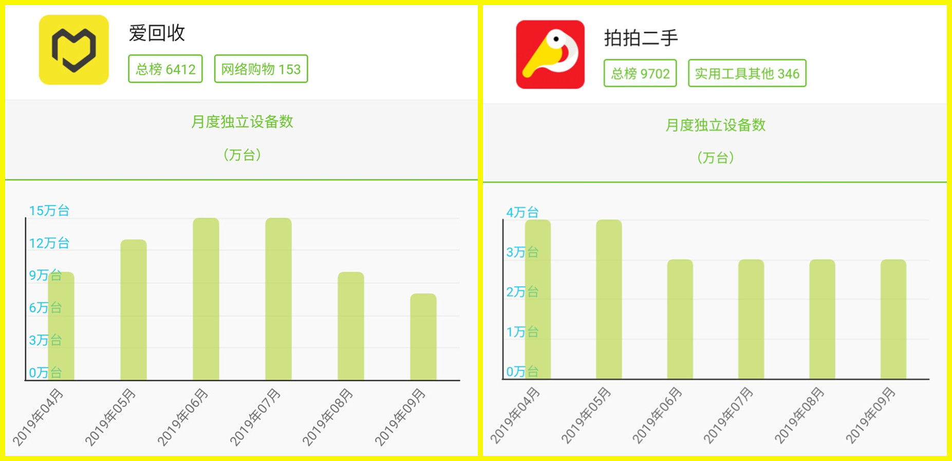 爱回收和拍拍的合并曾引起圈内不小的热议,一个是主打手机回收业务,一个主打二手商品交易平台,是标准的生态互补的战略合并。尤其是在闲鱼、转转发力C2B2C服务的背景下,缺“左腿”的爱回收和缺“右腿”的拍拍抱团,看上去是完成闭环。可从数据上来看,这种互补的合并,不仅未带来流量的提升,甚至造成了下跌。以爱回收举例,其月独立设备规模在8月、9月出现了非常吓人的下滑。拍拍二手虽然没有下滑,可也几乎没实现什么增长。