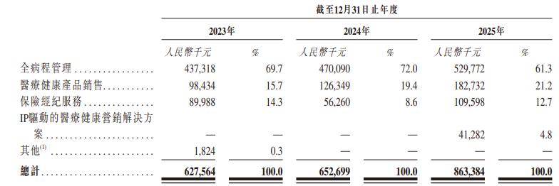 从收入结构来看,全病程管理业务稳居“C位”,占总收入七成左右,但2025年下滑至61.3%;医疗健康产品销售异军突起,收入占比从15.7%跃升至21.2%;保险经纪服务则大起大落,2024年占比一度“腰斩”至8.6%,2025年反弹至12.7%。