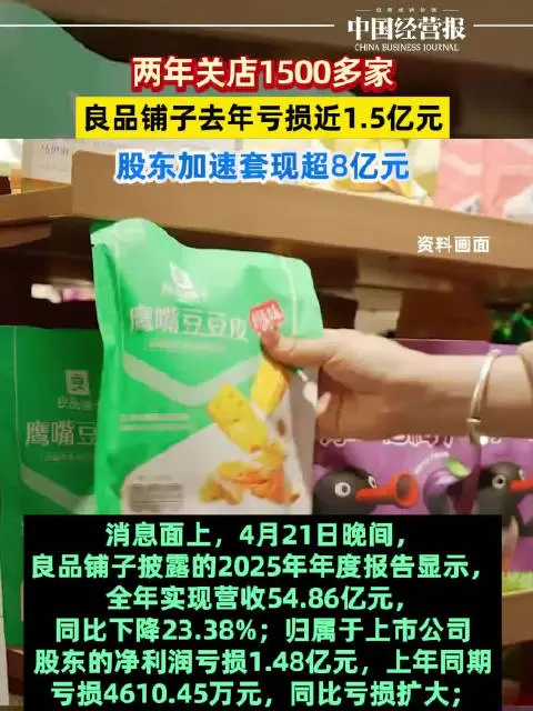 4月21日晚间,良品铺子2025年年报如一面镜子,映出这家曾风光无限的高端零食品牌的真实容颜:全年营收54.86亿元,同比锐减23.38%;净亏损1.48亿元,较上年4610万元亏损大幅扩大;而两年累计关店超1500家的数字,则如一道道伤疤,刻在其扩张版图上。