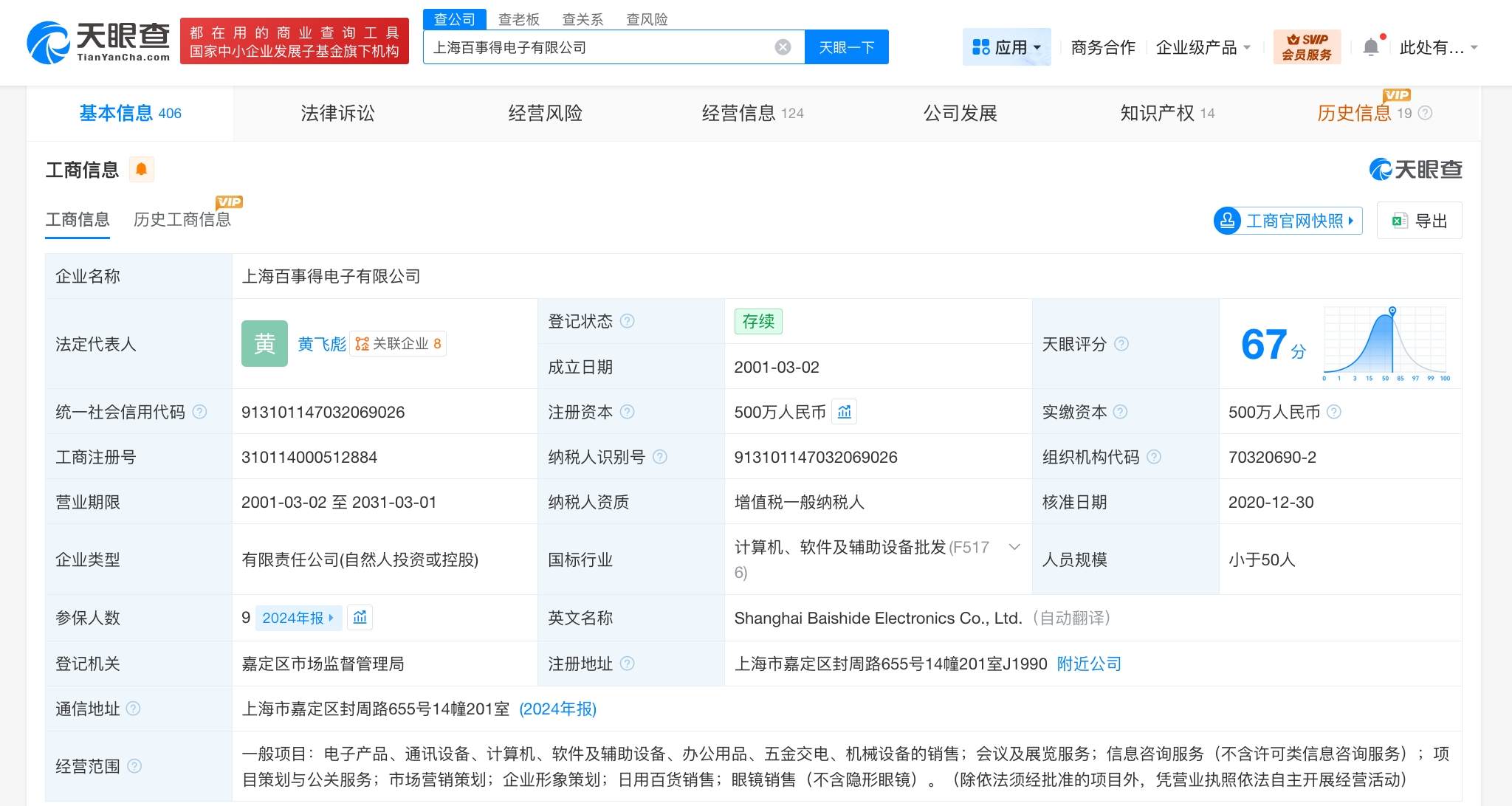 上海百事得电子有限公司成立于2001年3月,法定代表人为黄飞彪,注册资本500万人民币,经营范围含电子产品、通讯设备、计算机、软件及辅助设备、办公用品、五金交电、机械设备的销售,信息咨询服务,项目策划与公关服务等。股东信息显示,该公司由黄飞彪、代蔚蔚共同持股。