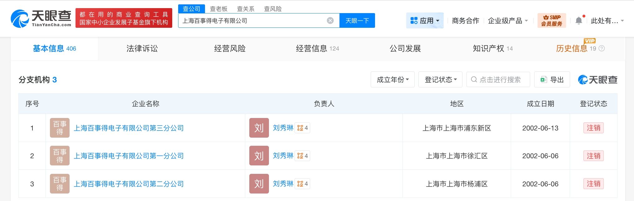 天眼查App显示,上海百事得电子有限公司成立于2001年3月,法定代表人为黄飞彪,注册资本500万人民币,经营范围含电子产品、通讯设备、计算机、软件及辅助设备、办公用品、五金交电、机械设备的销售,信息咨询服务,项目策划与公关服务等。股东信息显示,该公司由黄飞彪、代蔚蔚共同持股。分支机构信息显示,该公司旗下的三家分公司均已注销。