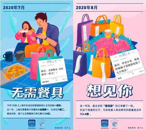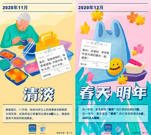 每月1个,共计12个备注关键词记录了过去这一年的不同寻常,也串联了人们日常生活的点滴记忆。除了像“无接触配送”这样2020年外卖备注里的新词,“白衣天使”、“加油”、“想见你”等备注关键词在2020年被提及的数量,均显著超过了2019年。