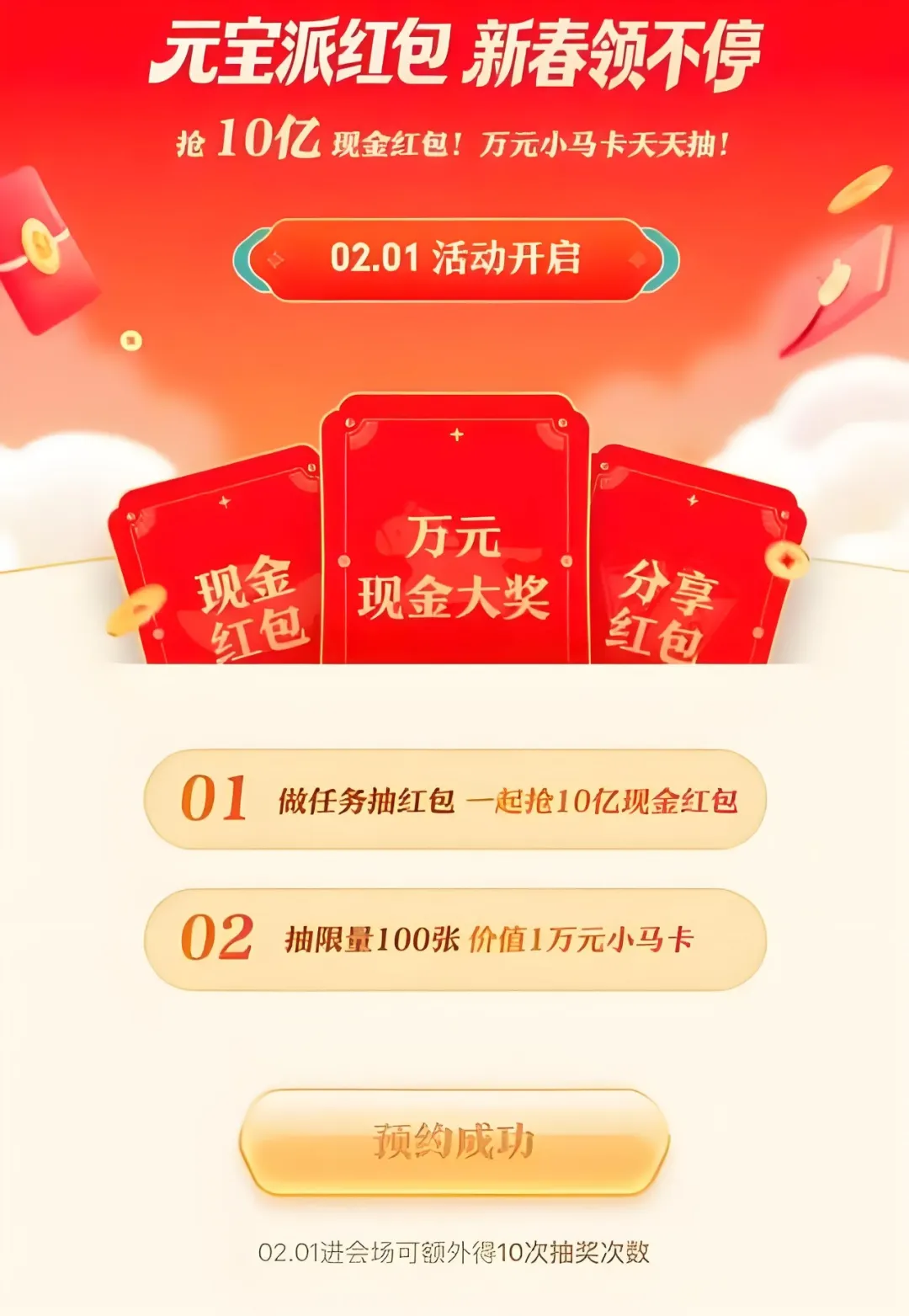 腾讯此次红包活动设计极为巧妙。用户需先将“元宝”App更新至2.55.0版本,才能看到首页的“春节分10亿”预约入口。完成预约后,2月1日起每日登录可领现金,做任务可抽限量“万元小马卡”,分享还能裂变至微信、QQ好友。更关键的是,所有奖金均可直接提现至微信零钱——利用社交关系链实现病毒式传播。