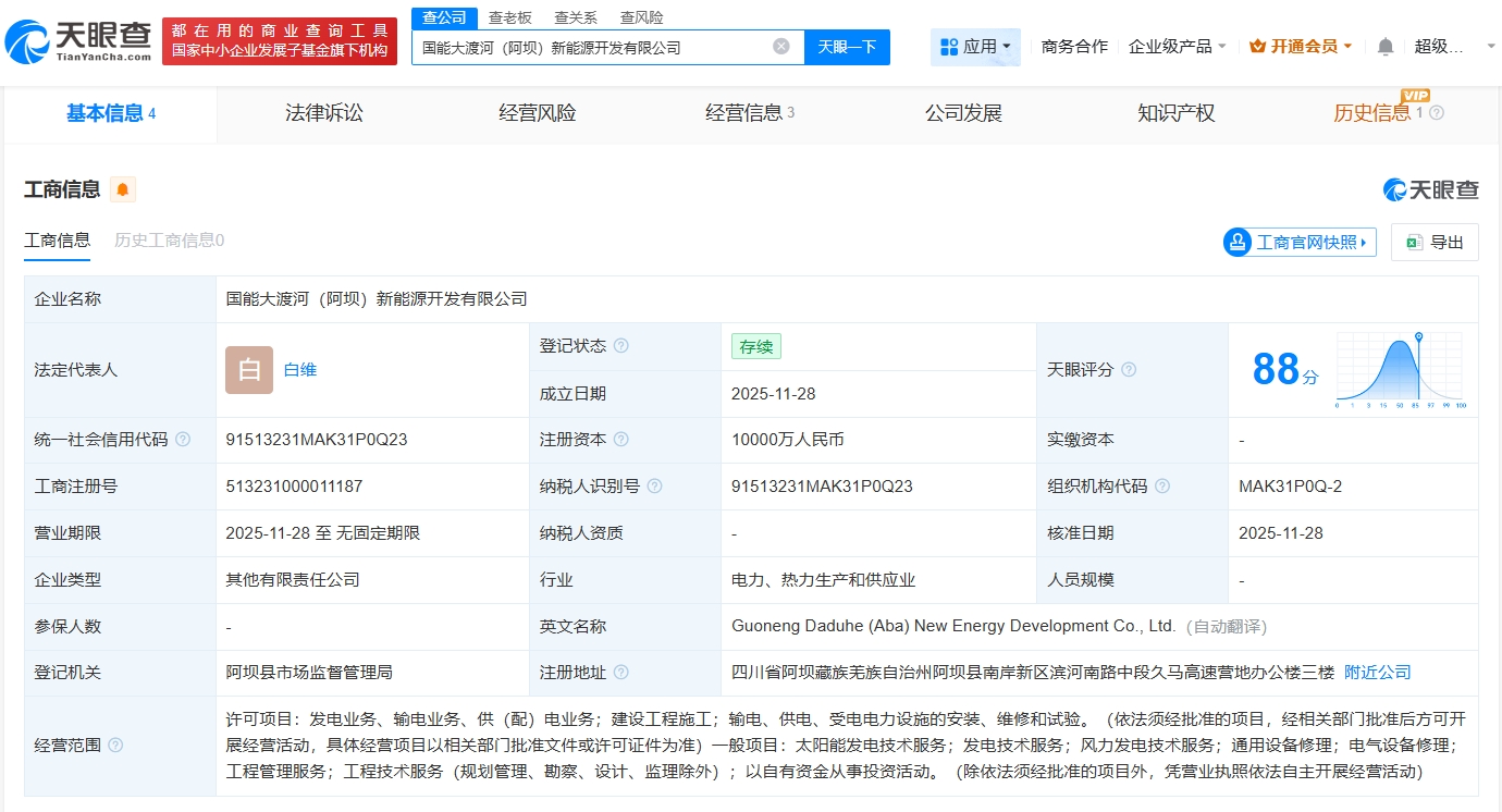 天眼查App显示,近日,国能大渡河(阿坝)新能源开发有限公司成立,法定代表人为白维,注册资本1亿人民币,经营范围包括太阳能发电技术服务、发电技术服务、风力发电技术服务、通用设备修理等。