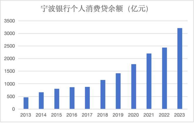 押宝个人消费贷是宁波银行在众多城商行中脱引而出的因素之一。在2013年财报中,宁波银行首次披露个人消费贷余额,当年的宁波银行个人消费贷余额为468.49亿元。10年过去,宁波银行2023年个人消费贷达到了3209.58亿元,规模已经是十年前的7倍。