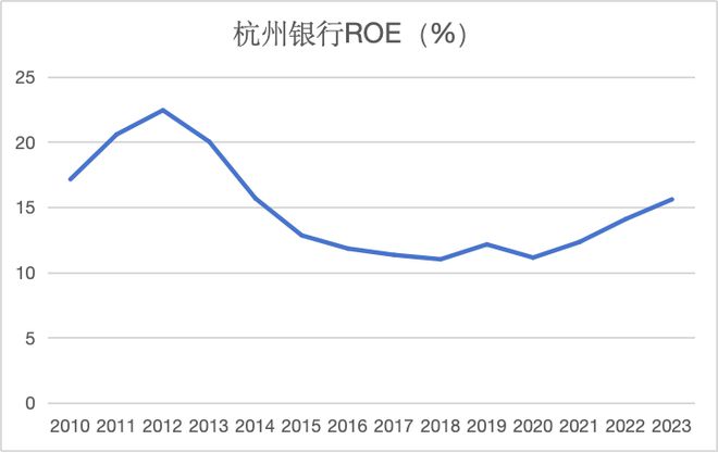 与宁波银行同在浙江的城商行杭州银行,ROE在过去四年则是不断上涨。2023年,杭州银行ROE为15.57%,近十年来首次超过宁波银行。