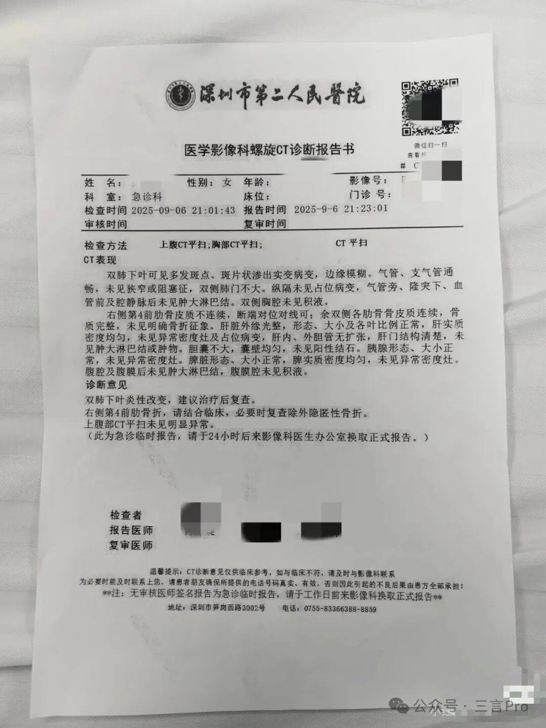 之后,该网友又晒出了深圳市第二人民医院螺旋CT诊断报告书。
